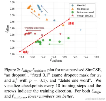 SimCSE模型作者通过可视化的方式从alignment和uniformity两个指标对比了几种不同样本增强的方法:\