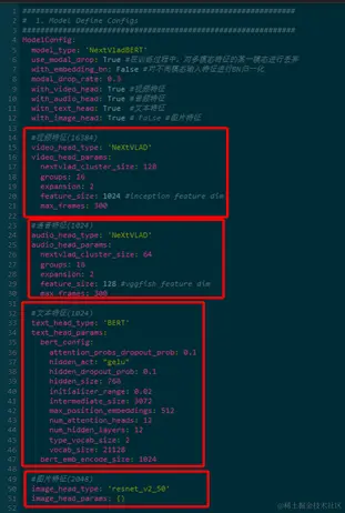 上图中通过下划线重点说明了对于多模态数据的特征抽取流程,其中红色代表对于视频、音频、文本和图片四种模态的特征抽取代码,绿色代表四种模态特征融合代码,黄色代表分类模块代码。个人感觉可以重点学习下项目的配置文件说明,因为最近刚好负责搭建半监督框架项目,感觉baseline中配置文件的管理特别规范,学习很多,所以这里进行详细说明配置文件config.tagging.5k.yaml: