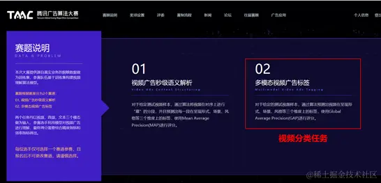 还是老套路介绍下背景,最近腾讯2021广告大赛开始了,有两个题目,第一个题目是视频广告秒级语义解析,第二个题目是多模态视频广告标签。随着视频尤其是短视频越来越火,人们在视频上投入的时间也越来越多。想要更深入的理解用户,挖掘用户的兴趣,那么对于视频数据源内容的理解也变得越来越重要,所以我选择了第二个题目《多模态视频广告标签》。这个任务本质上是一个视频分类任务,和我当前仅仅理解文本数据相比,视频内容不仅包括文本(视频字幕信息),而且包括视频、音频和图片等多模态信息,可以说更具挑战,想通过这个比赛学习下视频内容理解相关的知识,为后续理解视频内容做技术储备。下面是官方赛题说明图: