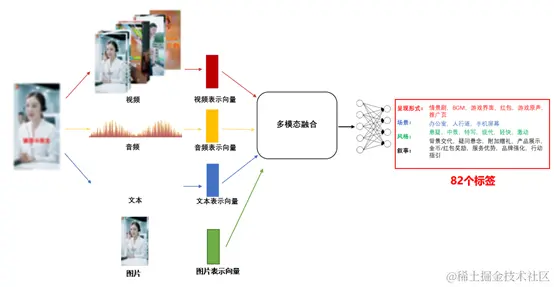 多模态视频广告标签任务本质上是一个视频分类任务。视频相比于传统的文本、图片模态来说更为复杂,同时包括视频、音频、图片和文本内容,想要很好的理解视频数据源,那么需要同时理解这四种模态的数据,所以任务的难度大大提升。可以说既需要懂CV知识,还需要懂NLP知识等等,这种任务难度升级,对应的挑战也升级,同时如果能搞定这类任务那么你的技术也会升级,对应的回报也会升级(主要是钱)。明确了动力需求,那么通过下图简单理解下多模态视频广告标签系统: