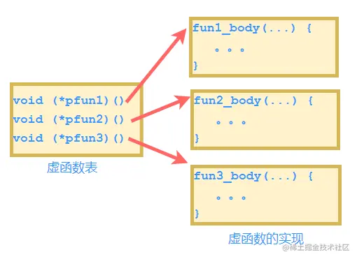 在C++中,如果一个父类中定义了虚函数,那么编译器就会在这个内存中开辟一块空间放置虚表,这张表里的每一个item都是一个函数指针,然后在父类的内存模型中放一个虚表指针,指向上面这个虚表。