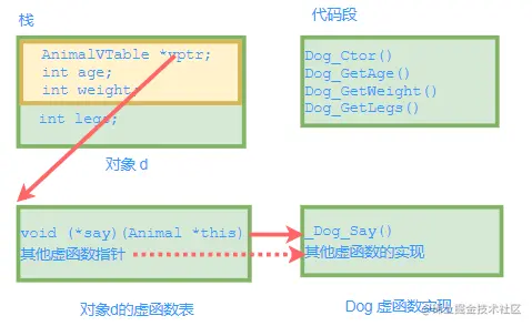 在栈空间定义了一个虚函数表animal_vtbl,这个表中的每一项都是一个函数指针,例如:函数指针say就指向了代码段中的函数_Animal_Say()。 > 对象a的第一个成员vptr是一个指针,指向了这个虚函数表animal_vtbl。