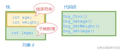 在代码段有一块空间,存储着可以处理Dog对象的函数;在栈中有一块空间,存储着d对象。由于Dog结构体中的第一个参数是Animal对象,所以从内存模型上看,子类就包含了父类中定义的属性。