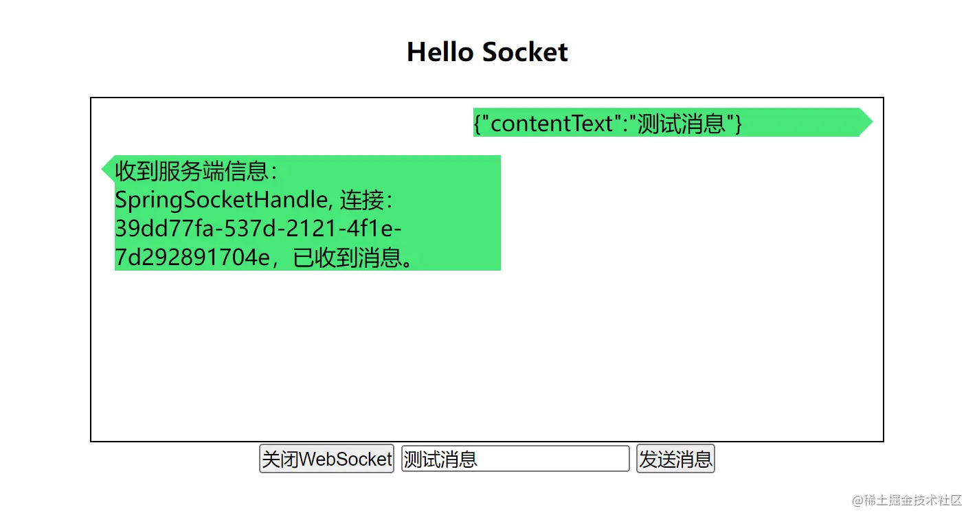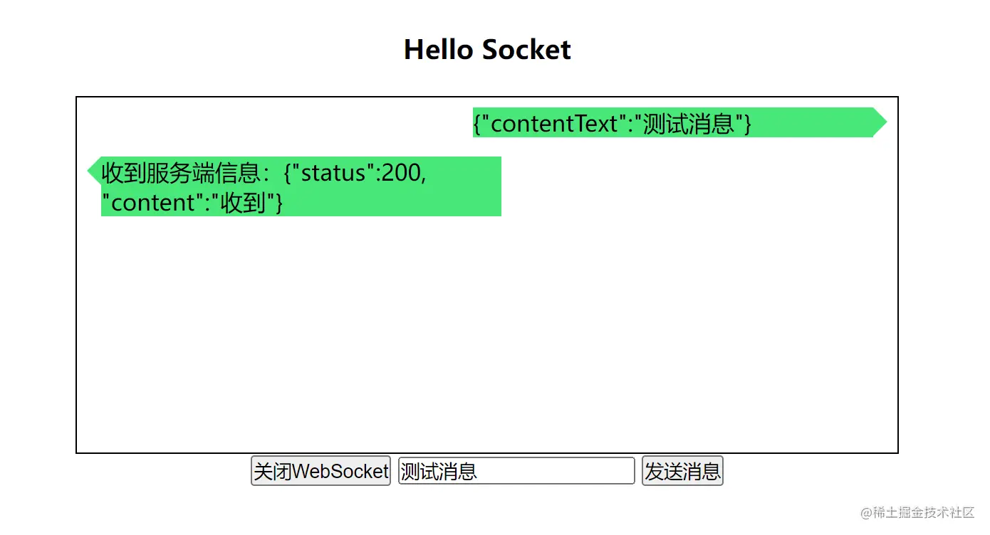 最后上个简陋的 WS 效果示例图,前端方面直接使用 HTML5 的 WebScoket 标准库,具体可以查看我的仓库代码: