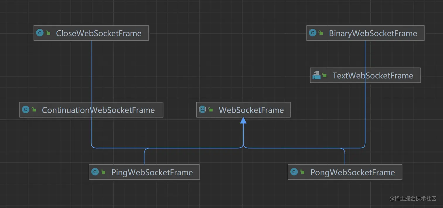 这里面的方法我都不说了,看名字就差不多知道了,主要是看一下这个类的泛型:TextWebSocketFrame,很明显这是一个 WS 文本消息的类,我们顺着它的定义去看发现它继承了 WebSocketFrame,接着我们去看它的子类: