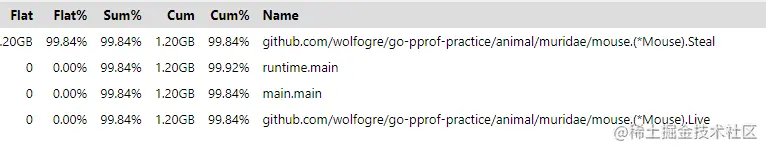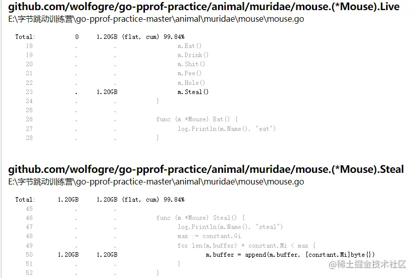 可以看出,占用堆内存最高的代码都指向了mouse.Steal函数, 查看源码如下