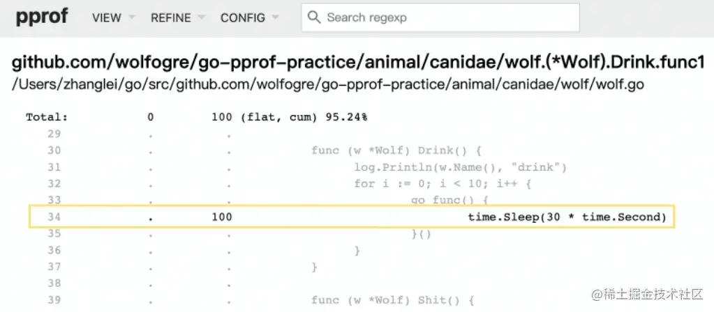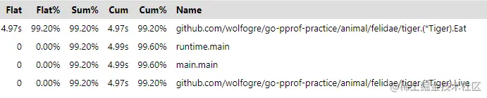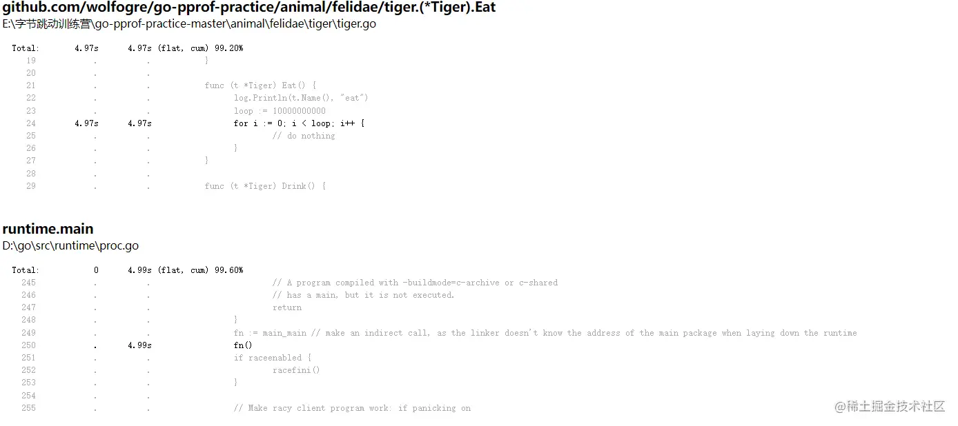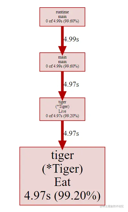 上述分别是graph,top表格和Source的形式,可以看出占用cpu最多的代码都指向了 tiger.Eat, 检查源代码可以看到确实有问题