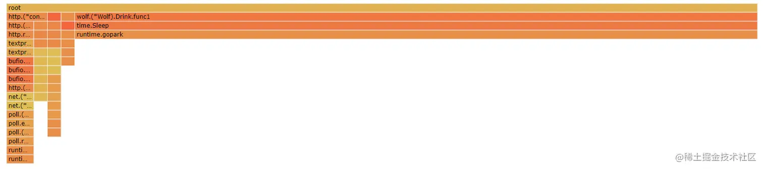 - 从上到下表示调用顺序,每一块代表一个函数,越长代表占用cpu时间更长