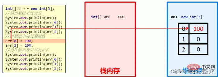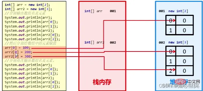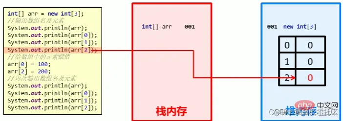 - 动态初始化先在堆内存生成一个new 一个arr 地址值,具体看编译器的结果,这里假设001。由于动态初始化,所以每个元素都有一个初始值,具体可以看上面的表。我们输出元素,先访问数组名地址,到堆内存下标,再输出元素值。
