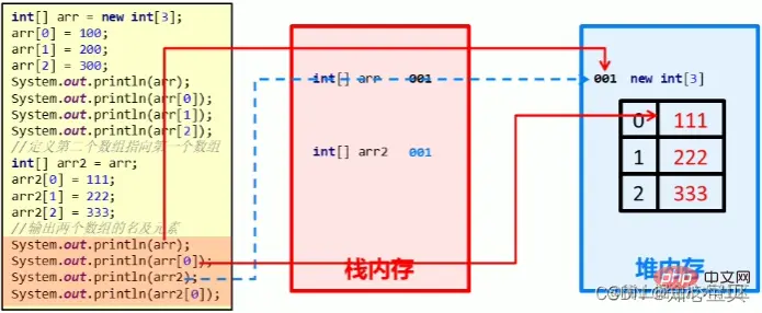- 假如我们把两个数组的地址值改为相同,修改后的结果该是如何,如下面的代码。