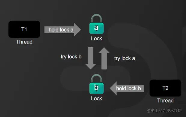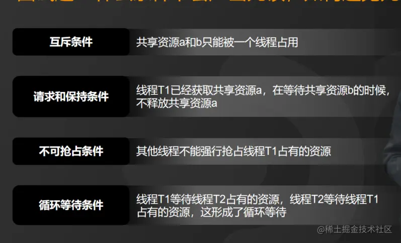 第一个:互斥条件,共享资源a和b只能被一个线程占用;