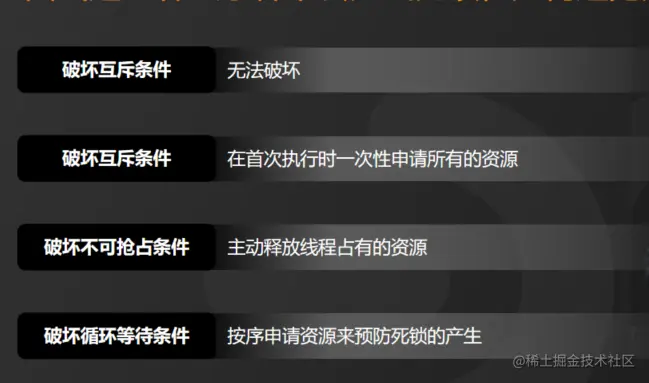 第二个,对于不可抢占条件来说,占用部分资源的线程在进一步申请其他资源的时候如果申请不到,我们可以主动释放它占有的资源。这样不可抢占这个条件就被破坏了。
