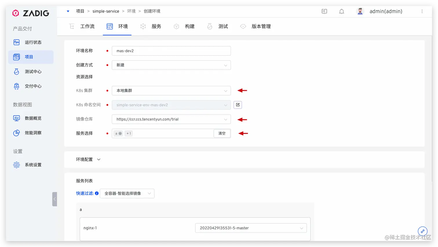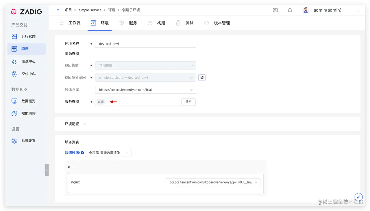 在 dev 基准环境中通过点击创建子环境,按需选择服务即可创建包含部分服务的子环境 dev-test-env1
