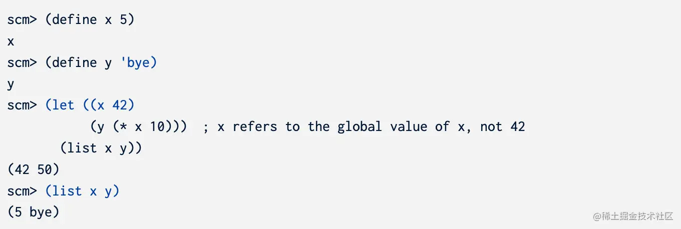 (let ((x 42) (y (* x 10))) (list x y))语句当中,绑定y时用到的x是全局的值,也就是5,而不是刚刚绑定的42。因为绑定值的操作是最后一起执行的,x和y是一起绑定的。有一点类似于以下的Python代码: