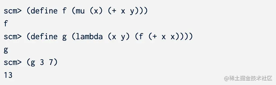 mu表达式类似于lambda表达式,但不同的是,当evaluate mu语句时,它是动态scope的。lambda表达式是静态scope,因为lambda表达式执行的时候,使用的env 是lambda创建时的frame。而mu使用的是表达式执行时的frame,因此是动态的。