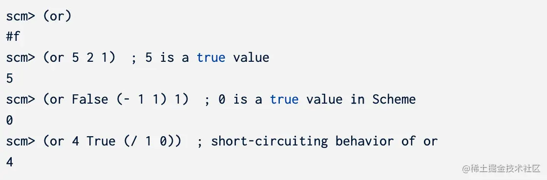 对于or语句来说,我们也需要从左往右评估每一个子语句的值。如果某一个子语句的结果是true,直接返回。否则返回#f。如果输入为空,也返回#f。