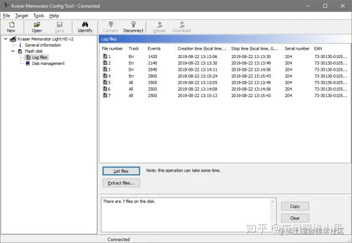 将Kvaser Memorator Light HS v2连接到Kvaser Memorator配置工具时,每个记录文件都会被标记为存储“Err(错误帧)”或“All(所有报文)”,依据该记录文件来自哪一个缓存。