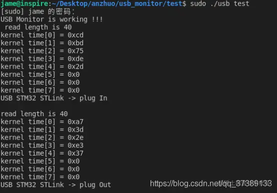 通过字符设备驱动方法,让用户和驱动程序交互。这里主要参考了suspend_monitor,使用proc_create的方法,创建/proc/usb_monitor文件。考虑程序简易性,工程中只有读方法(.read),舍去了写方法(.write)。读函数中也参考了suspend_monitor中许多保护和进程阻塞优化的部分。到此,最终实现也只要在用户程序中读取/proc/usb_monitor即可。