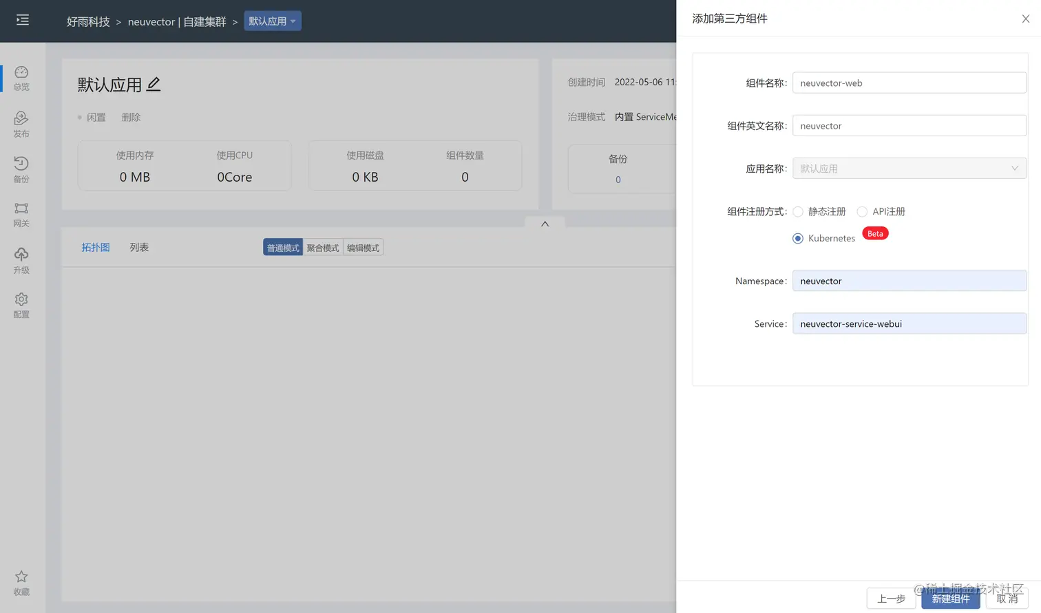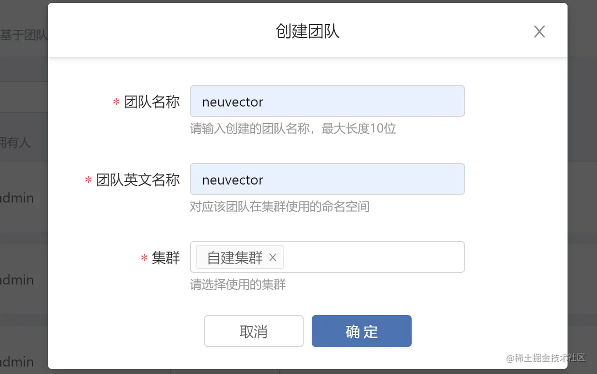 NeuVector 通常是安装在 neuvector 命名空间里面的,而在 Rainbond ,团队的概念则是对应 kubernetes 里命名空间,所以通过 helm 安装的时候,首先需要创建出来对应的团队,团队的英文名对应的则是该团队在集群中的命名空间,此处填写 neuvector,选择对应集群即可。