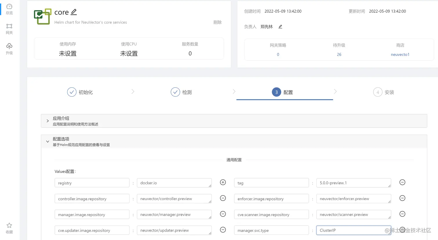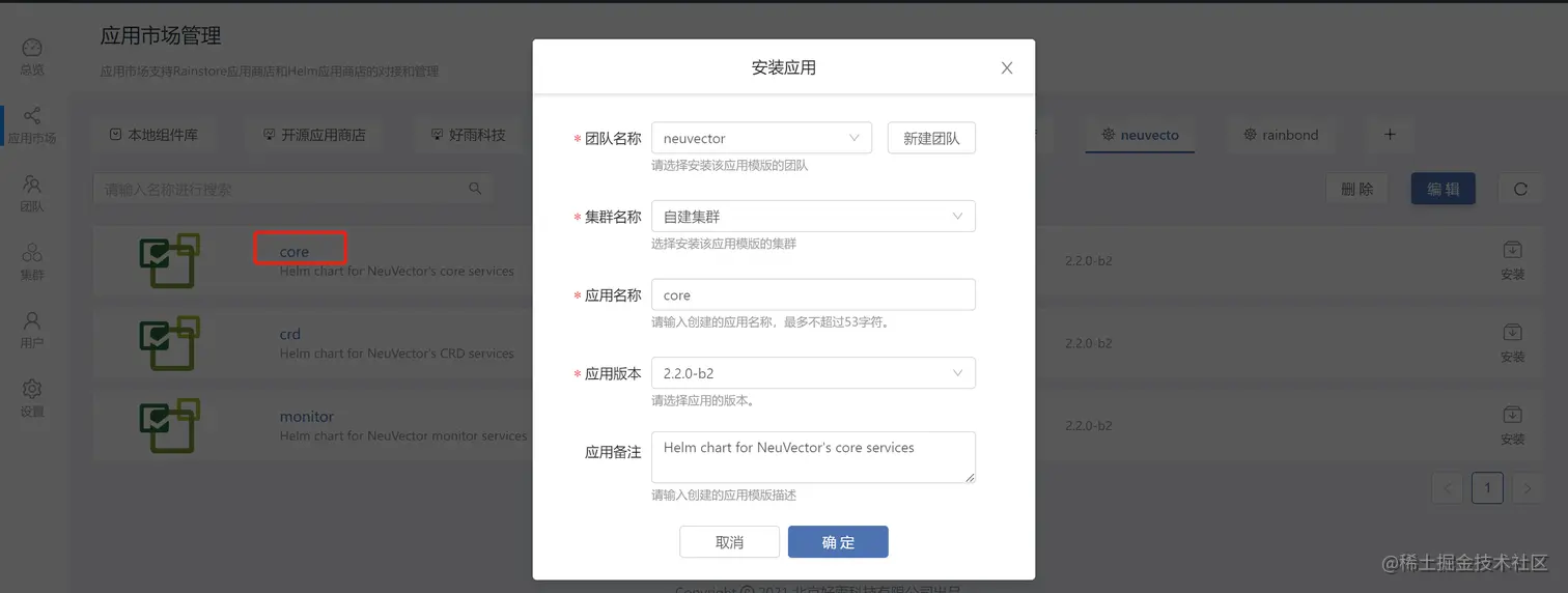 在 helm 仓库找到 core 点击安装到 neuvector 团队里即可