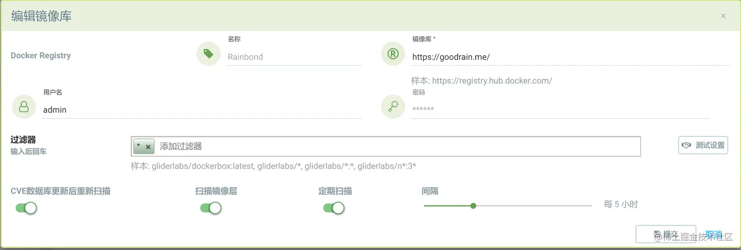 如果在对接 Rainbond 时使用了外部的镜像仓库,且域名可以被解析到的情况,可以直接填写域名即可,因为 goodrain.me 本身是不能被 NeuVector 解析的,所以需要通过集群的 coredns 手动添加对应的解析,来确保 NeuVector 可以连接上。