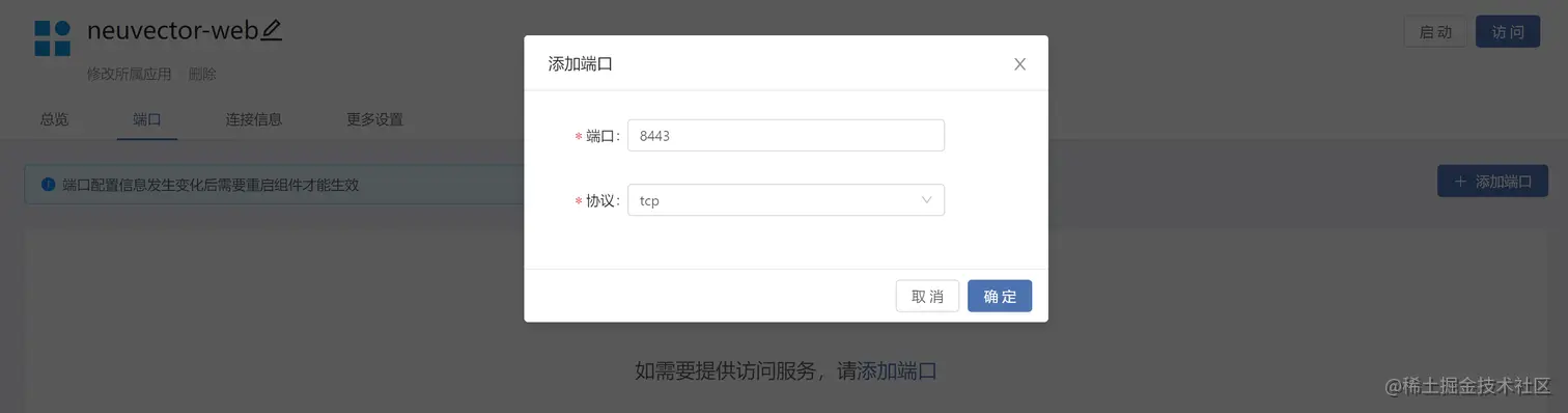 neuvector 提供了可视化操作的界面,安装过程将自动创建Service,通过Rainbond平台第三方组件的形式可将 neuvector 的访问端口暴露出来。
