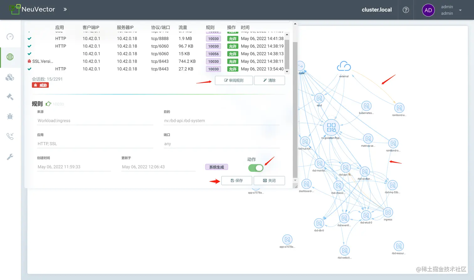 NeuVector 提供的网络活动,可以清楚的查看每一个 pod 之间的网络流量动向。以及对应的端口,规则,更加清晰明了的查看走向。