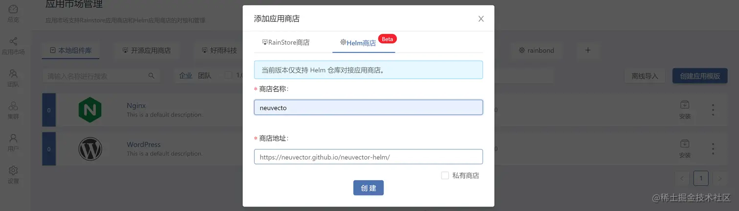 Rainbond支持基于helm直接部署应用,所以接下来对接 neuvector 官方helm仓库,后续基于Helm商店部署 neuvector 即可, 在应用市场页面,点击添加商店,选择helm商店,输入相关信息即可完成对接。
