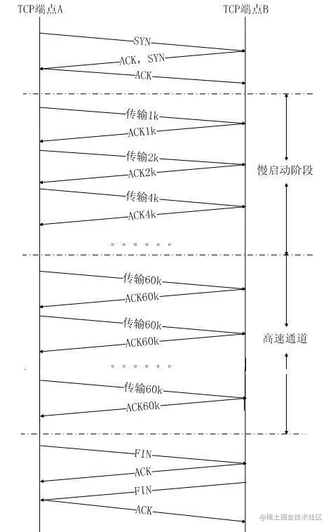 对方确认的过程中去计算对方的接收速度,来逐步增加每次发送的数据量(最后到达一个稳定的值,进入高速传输阶段。相应的,慢启动过程中,TCP通道处在低速传输阶段),