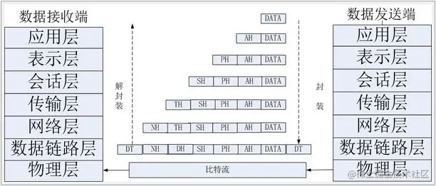 应用层发下来,会在每一层都会加上头部信息,进行 封装,然后再发送到数据接收端。这个基本的流程你需要知道,就是每个数据都会经过数据的封装和解封 装的过程。