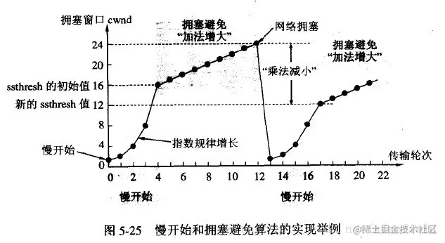 拥塞避免:cwnd的值不再指数级往上升,开始加法增加。此时当窗口中所有的报文段都被确认时,cwnd的大小加1,cwnd的值就随着RTT开始线性增加,这样就可以避免增长过快导致网络拥塞,慢慢的增加调整到网络的最佳值。(它逻辑很简单就是到一定值后,cwnd不在是指数增长,而是+1增长。这样显然慢多了)。