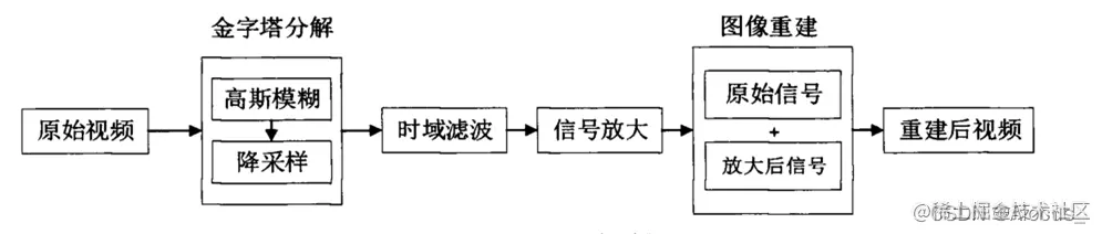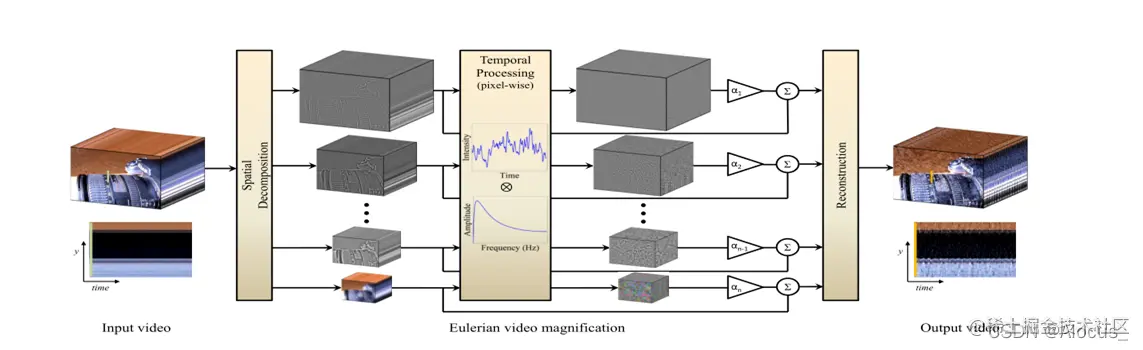欧拉视频放大采用标准视频序列作为输入,应用空间分解之后,然后对帧进行时域滤波。对特定信号放大之后,合成重构,得到结果。