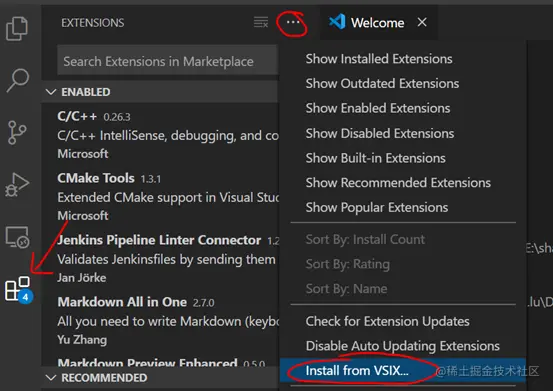 进入到visual code,在插件设置中,选择install from VSIX。