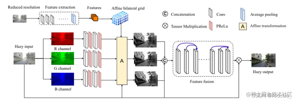 上面是该去雾网络的主要架构图,核心采用双边网格,双边网格能够关注色彩突变的物体边界,并能够很好的关注于高频信息。可以看到非常地简洁,实际上,为了简洁而简洁可能有时候会对读者造成一定的误导。建议阅读源代码。