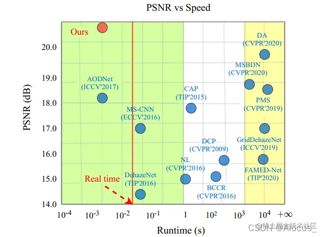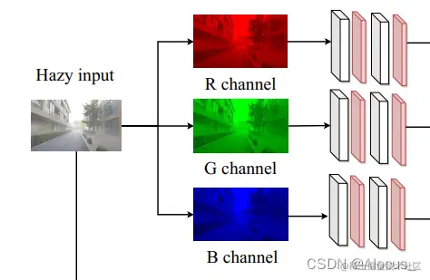 在该模型中的特征提取部分代码里使用的是Unet网络,图中则画的很简单,另外在RGB图像表示部分也不够清楚,实际上在图像输入之后也会有一个Unet进行特征提取,然后对提取后的特征分别进行三次卷积,以生成三个通道共九个通道的R, G, B channel。论文在速度上堪比AODNet,这点有待商榷。据论文所述,在实时性方面达到较好结果。