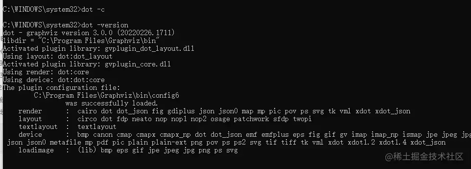 在通过管理员打开命令行先win+R 输入cmd ctrl+shift+回车, 输入dot -c,在输入dot -version, 出现下面的画面则成功,否则检查环境变量是否配好,并重启生效