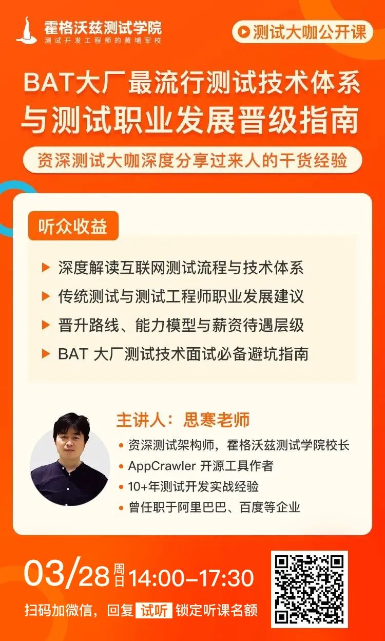 为了帮助大家更好的面试大厂,找到心仪的工作,本周日(3月28日下午2点-5点),霍格沃兹测试学院测试大咖思寒老师为你指点迷津,从过来人角度深度解读**「BAT 最先进的互**联网测试技术体系 + 测试面试必备攻略 + 测试职业发展晋级指南」。