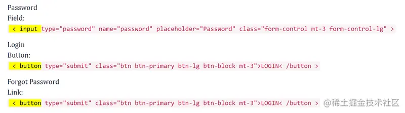 DOM 结构中,元素都有自己的 tag,比如 input tag, button tag, anchor tag 等等,每一个 tag 拥有多个属性,比如 id, name, value class,等等。下面的高亮部分就是 tag: