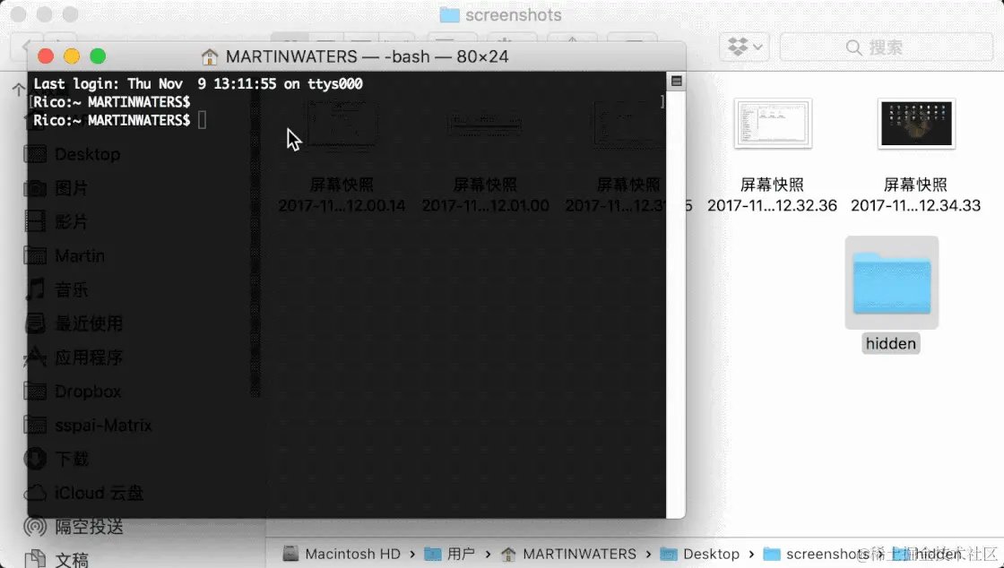 在 Windows 上隐藏文件夹大家应该都是老手了,转到 Mac 后,却发现隐藏文件夹和自己想象有那么一些不一样。为了更好的把大家的「小秘密」藏到内心最深处的地方,也可以使用两段命令来完成操作。跟前文一样,我们需要获取文件夹的路径,然后在终端中输入以下代码: