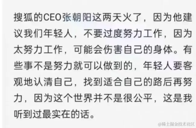 可能有些人一看到这句话,以为张老板在提议年轻人就地躺平,其实完全不是这个意思,他说的是“不要过度努力”,注意在“过度”2个字上,不是不努力,而是该努力工作还是要努力工作,努力学习还是要努力学习,但也要掌握一个度,没必要一直打鸡血玩命的努力,尤其是不要抱着努力就一定有结果,就一定能逆天改命。这样搞下去,不一定会改变命运,可能还会没命。