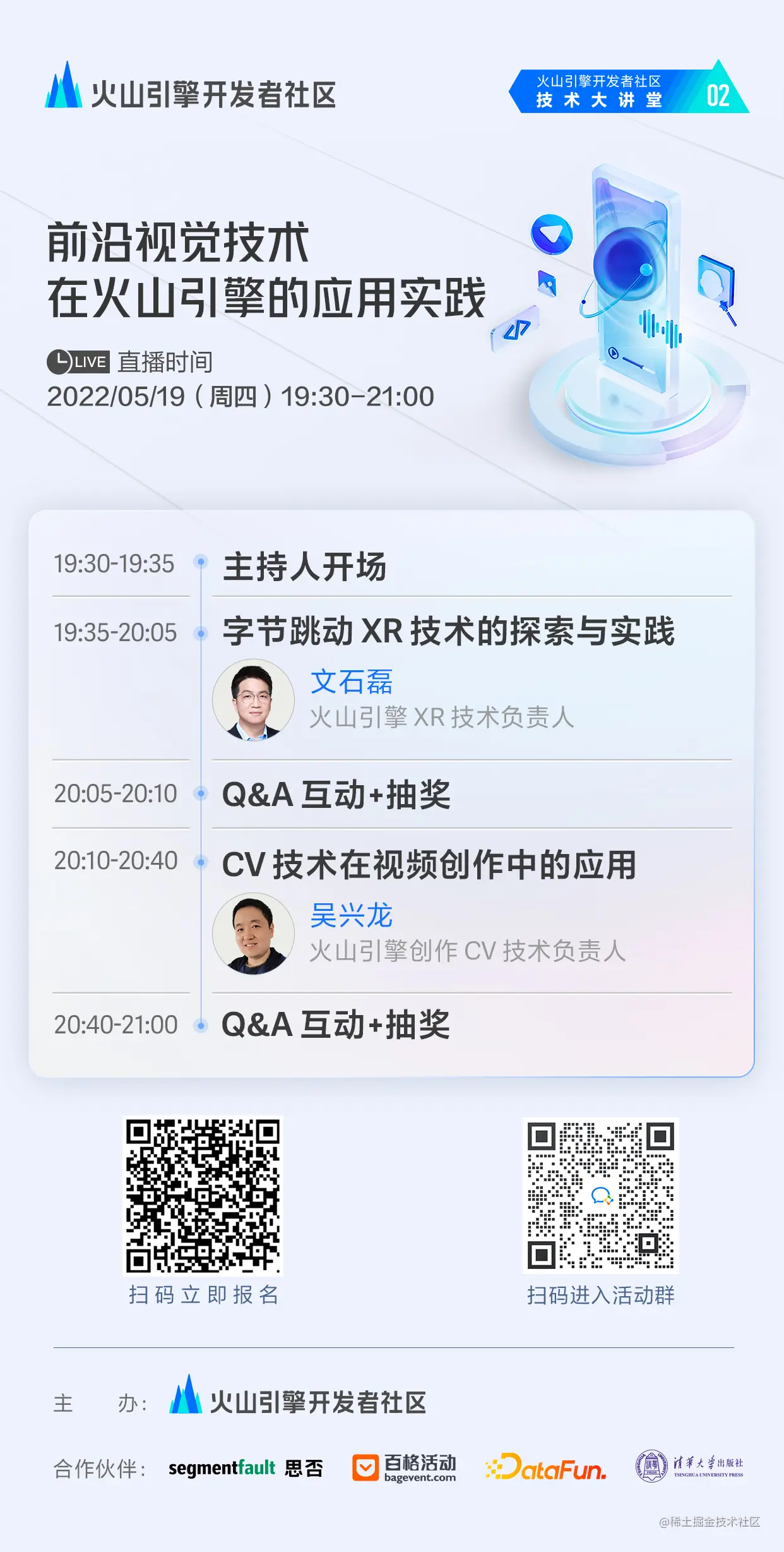 5 月 19 日晚,火山引擎开发者社区技术大讲堂第二期邀请到了火山引擎 XR 技术负责人和火山引擎创作 CV 技术负责人,为大家分享字节跳动积累的前沿视觉技术及内外部的应用实践,揭秘现代炫酷的视觉效果背后的技术实现。