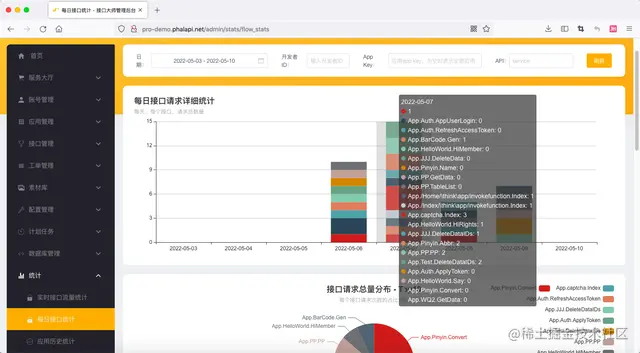 最后,回到管理后台,可以看到全服的接口流量统计,每个应用、每个客户不同的统计数据。