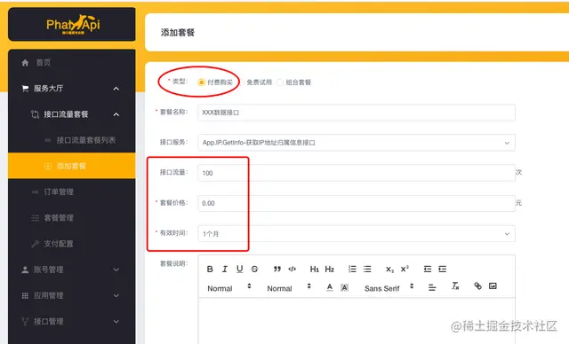 有了业务数据,也有了API接口,下一步就是为我们提供的API数据接口设置费用和套餐。