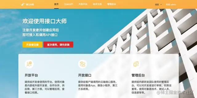 接口大师的系统项目主要分为5个子系统:平台展示官网、管理后台、开放平台、OpenAPI及在线接口文档、技术开发文档。