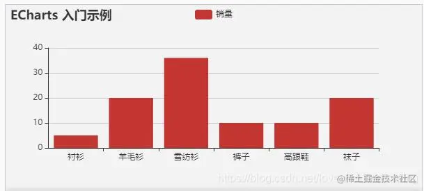 通过 echarts.init 方法初始化一个 echarts 实例并通过 setOption 方法生成一个简单的柱状图,下面是完整代码。