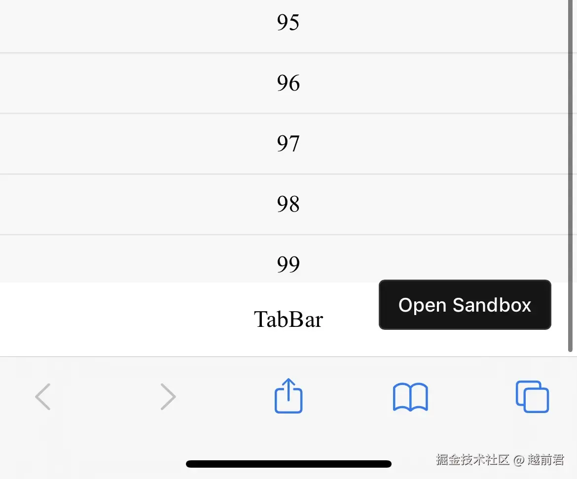 截图中已滑动至页面最底部,然而 100 被 TabBar 部分挡住了(其他浏览器均能正常展示出来)。