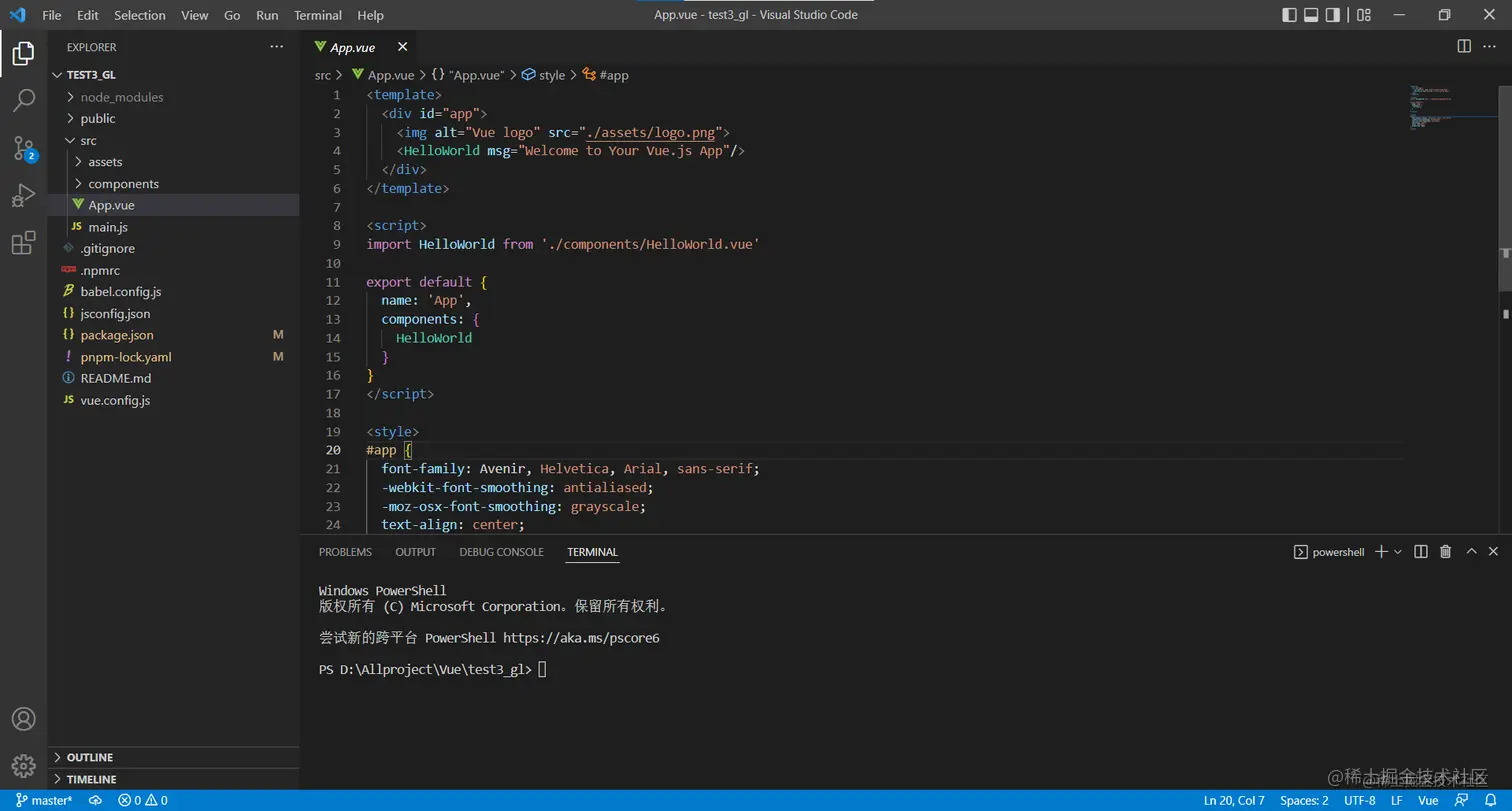 为了方便大家更好的理解这个模块话搭建的概念,这里将使用Vue这种项目开源JS开发框架来上手开发,并且在Vue项目中引入ThreeJS来进行实践。那么我们接下来将在控制台中输入以下一些命令行来进行操作: