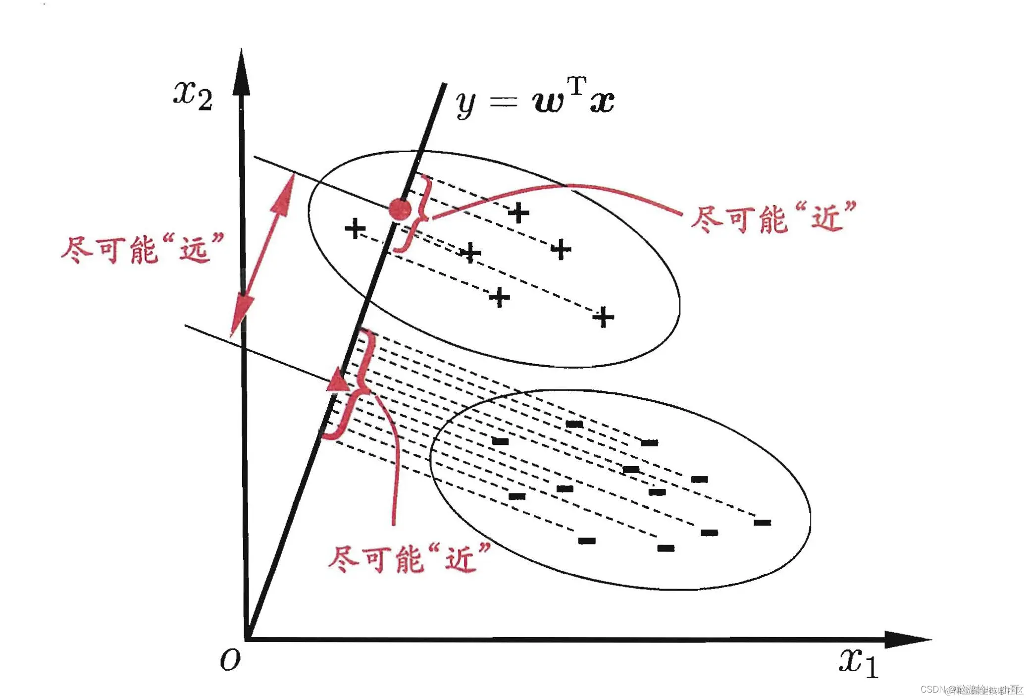 设法找到这样一条直线,把给定的样例集投影在该直线时,使得同类样例的投影点尽可能接近、异类样例的投影点尽可能远离。