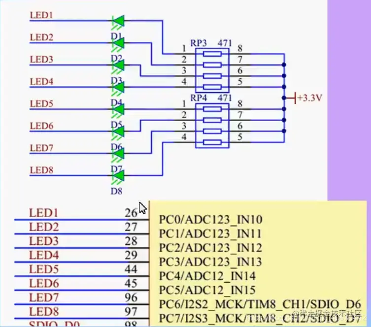 由电路图可知LED1连接的是PC0端口,我们要将PC0端口置零,则导通,LED灯亮起