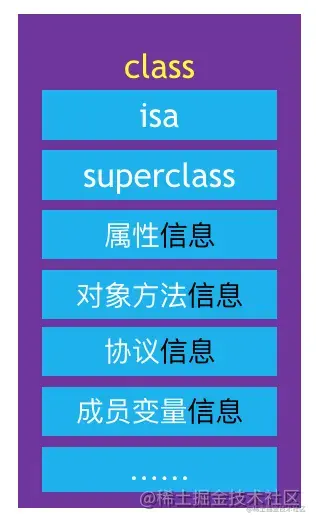 class对象中存储着:isa指针,superclass指针类的属性信息,类的成员变量信息,类的对象方法,和类的协议信息